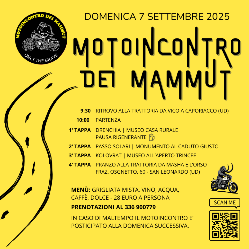 Vi aspettiamo al nostro motoincontro annuale dei Mammut che si terrà domenica 7 settembre con partenza qui alla Trattoria da Vico a Caporiacco (UD) alle ore 10:00.